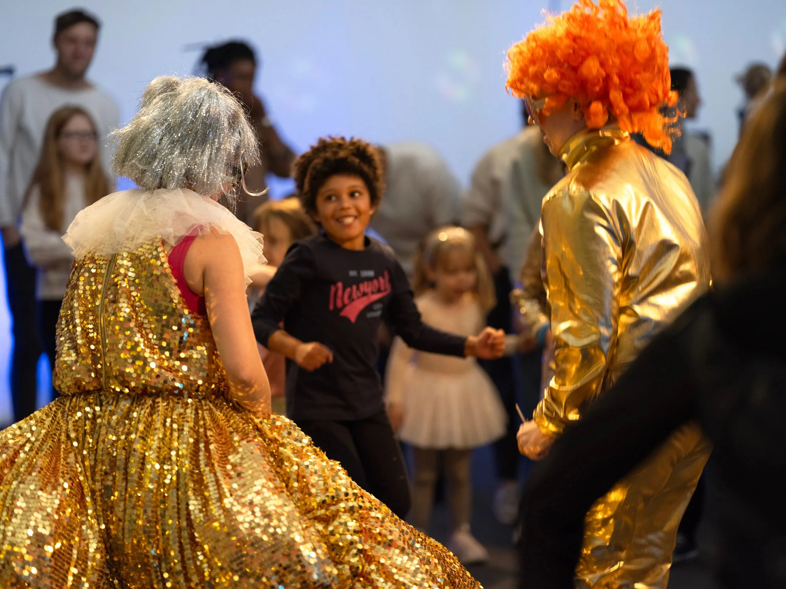 Autumn 2024's Arty Party artist was performer and clown Marie Kallevik Straume. Alongside collaborators Anna Marie Simonsen & Cecily Nash, children aged 0+ were brought into Marie and her team’s universe, informed by their background as clowns and theatre makers. There was clowning, disco, an open mic stage and more.